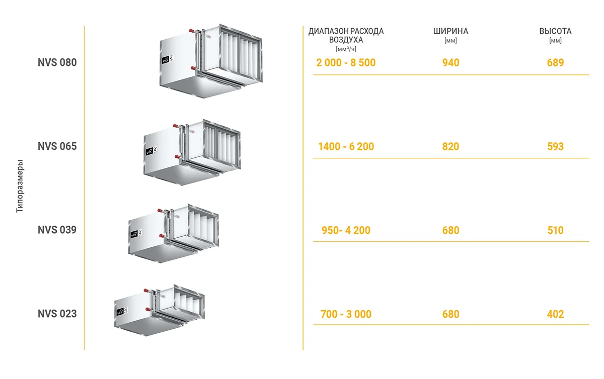 - **** для водяного нагревателя и базового агрегата с охладителем необходимо учитывать длину выступающих патрубков.150 мм для нагревателя, 90 мм для охладителя водяного и 60 мм для охладителя с прямым испарением хладагента. Для электрического нагревателя необходимо учитывать длину выступающей части блока автоматики: сбоку - 120мм, сверху (NVS23) - 15мм.