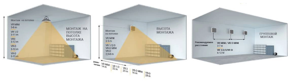 Несоблюдение при монтаже минимального расстояния 25 см (VR MINI EC, VR-D MINI EC) и 35 см (VR1 / VR2 / VR3 / VR-D) от стены или потолка при установке агрегата может привести к неправильной работе агрегата, возможности повреждения вентилятора или повышенному уровню шума во время его работы.
